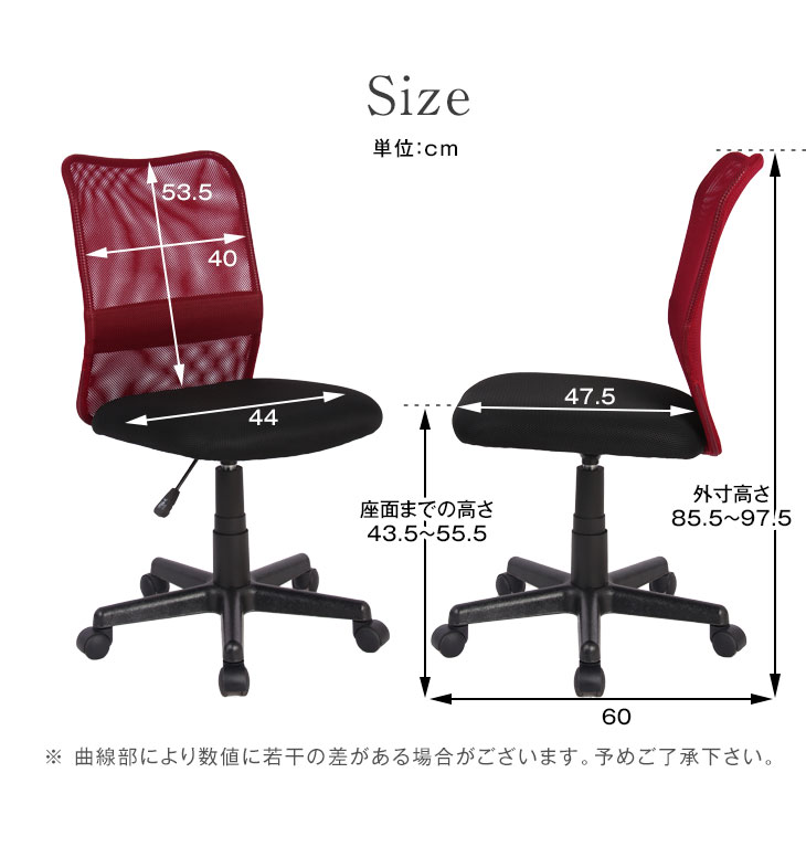 メールでのお問い合わせはこちらstorage-g@shop.rakuten.co.jp仕様サイズ外寸:幅60×奥行60×高さ85.5〜97.5cm座面の高さ(SH):43.5〜55.5cm【スタッフみどぅのおすすめポイント!】 ・蒸れにくいメッシュ ・取り扱いやすいスタンダードなデザイン ・お尻を優しく受け止める6cm厚クッション ・体に沿った背もたれで正しい姿勢をサポート重量約11kg耐荷重約80kg素材【張り地】オールメッシュ生地(ポリエステル100%) 【内部】ウレタンフォーム【脚部】合成樹脂【キャスター】ナイロンカラーブルー、ブラック、ワインレッド梱包サイズ幅56.5×奥行60.5×高さ24.5cm/重量:約13kg生産国中国送料【送料無料(北海道・沖縄県・離島は送料別途)】※北海道・沖縄県・離島の場合はお問い合わせください。