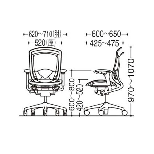サイズ:幅620〜710×奥行600〜650×高さ970〜1070(座面高420〜520)mm 材 質:背フレーム/アルミダイキャスト 肘/アルミダイキャスト スチール 樹脂成型品 キャスター/直径75mmナイロン双輪キャスター 規格・性能・加工 グリーン購入法適合商品 社団法人日本オフィス家具協会(JOIFA)が認めた、地球環境に非常に優しい商品です。
