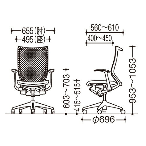 サイズ:幅655×奥行696×高さ953〜1053(座面高415〜515)mm 材 質 背フレーム/アルミダイキャスト 肘パッド/熱可塑性ポリウレタン デザインアーム/アルミダイキャスト 脚/アルミダイキャスト キャスター/直径60mmナイロン双輪キャスター 規格・性能・加工 グリーン購入法適合商品 社団法人日本オフィス家具協会(JOIFA)が認めた、地球環境に非常に優しい商品です。